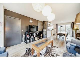 It comprises an entrance hall leading to a bright living area (living/dining room) and a fitted kitchen (induction hob, refrigerator, freezer, dishwasher, microwave) with direct access to the terrace and garden via a large bay window. A multipurpose room (bedroom, office, games room or gym) with a mezzanine and pellet stove completes this level. There is also a master suite with a bedroom, dressing room, and bathroom (bathtub, shower, double sink).