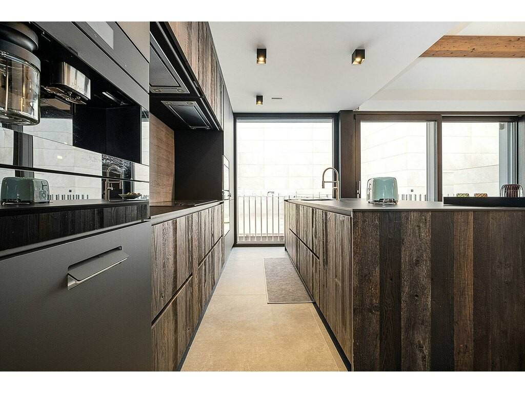 Anschließend gelangen wir in die voll ausgestattete, vom Architekten entworfene Küche, die zu einem beeindruckenden Wohnzimmer mit 8 Meter hohen Decken hin offen ist. Die Terrasse, der Landschaftsgarten und der Pool sind von dieser Etage aus zugänglich.