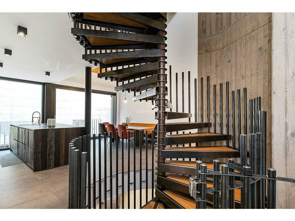 Das Erdgeschoss öffnet sich zu einer großen Eingangshalle mit Aufzug und einer spektakulären Wendeltreppe, die das Herzstück der Innenarchitektur bildet.