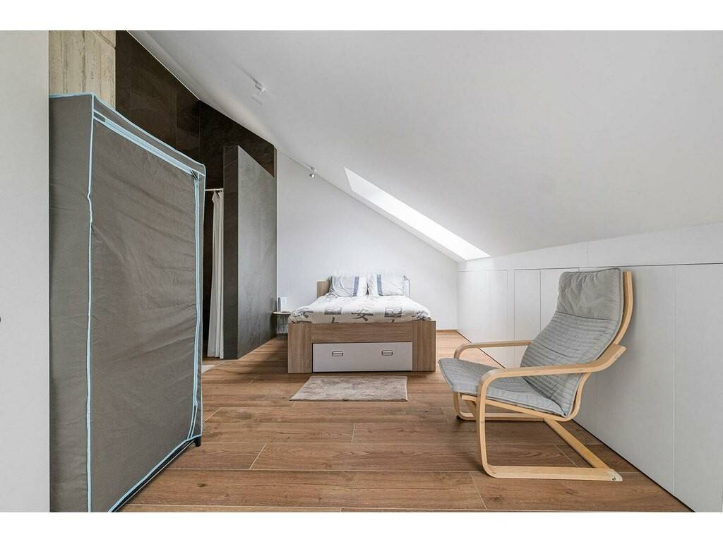 Die oberste Etage umfasst ein Schlafzimmer mit eigenem Bad und einen Fitnessbereich mit Blick auf das Wohnzimmer.