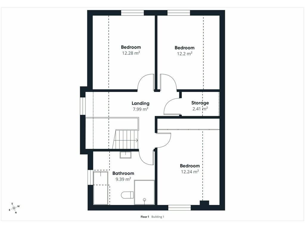 First floor: Hallway (8 m²) - 3 bedrooms (12.2 m², 12.2 m² and 12.3 m²) - bathroom with bath, shower and WC (9.4 m²)
