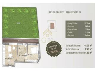 We propose this apartment in future state of completion which is composed as follows: - One bedroom - Kitchen opening onto living room - Terrace - Private garden - Shower room - Entrance hall - Cellar