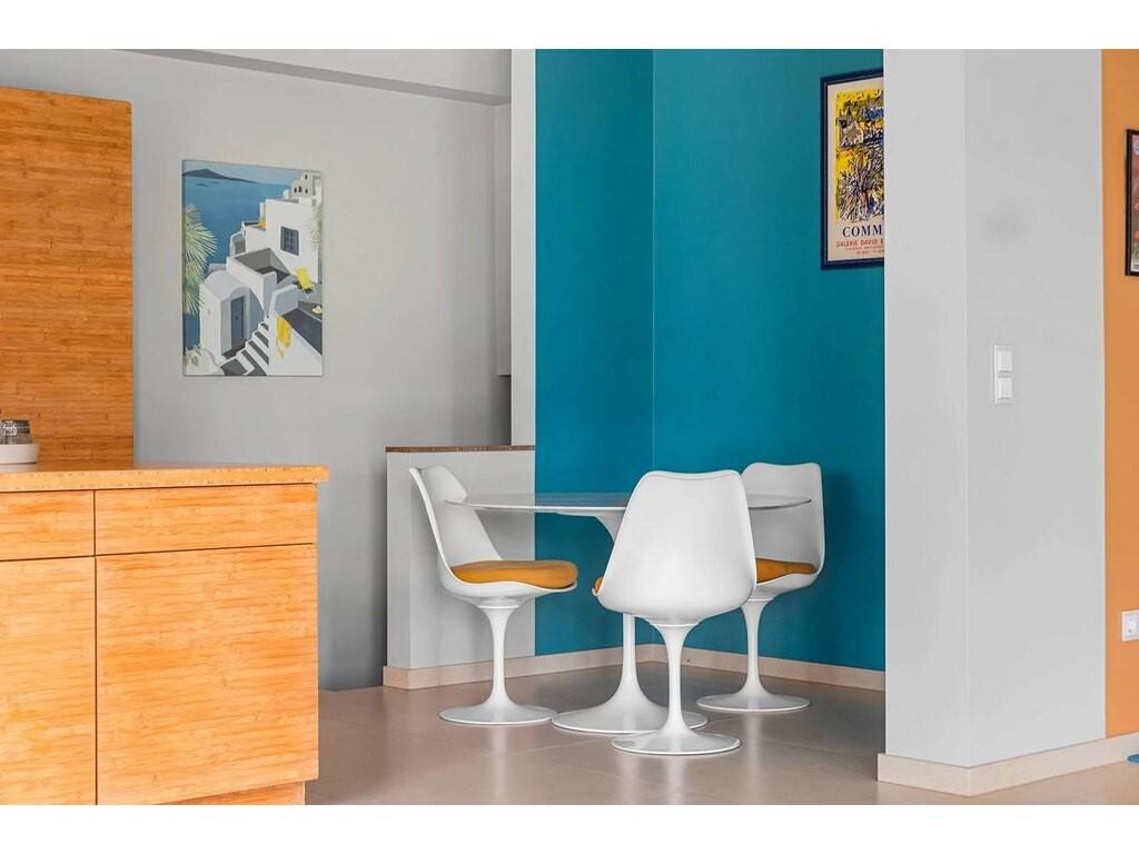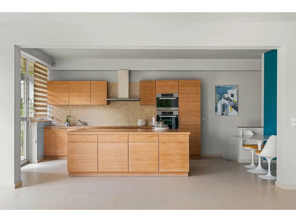 A large living room with a surface area of approximately 81m² comprises a dining room, a lounge with an open fire and a solid bamboo kitchen with a central island and breakfast area. The kitchen is fully equipped and optimised with top-of-the-range Miele appliances.