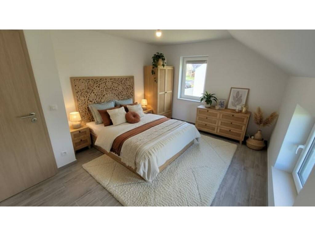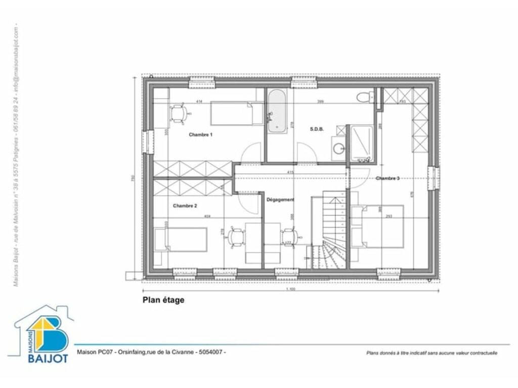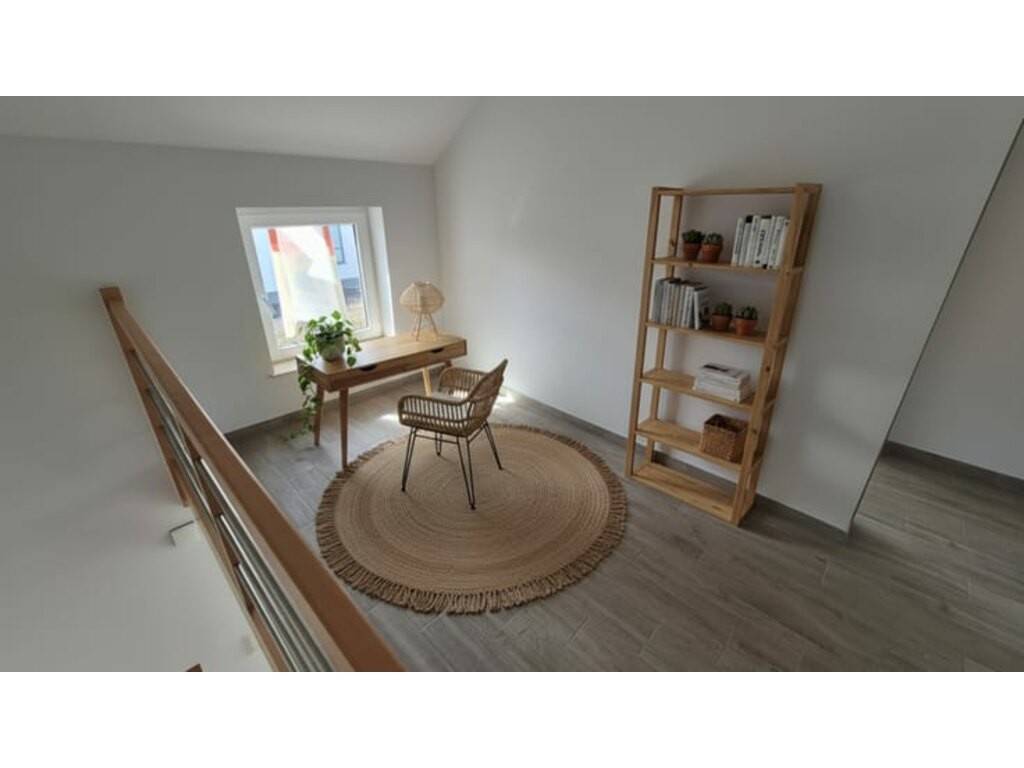 À l’étage : • Un hall de nuit lumineux avec espace bureau • Trois chambres, dont une avec espace dressing • Une salle de bains complète (baignoire, douche, meuble lavabo et WC)