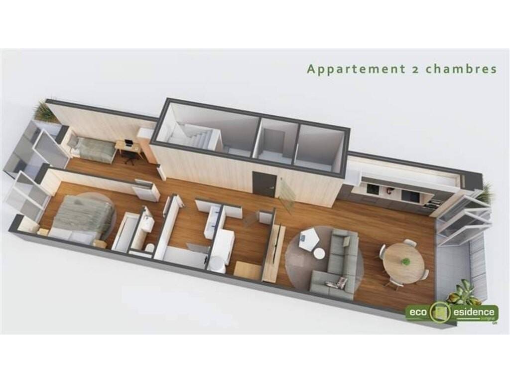 Performances Q-Zen : châssis triple vitrage, besoins en chauffage très faibles, climatisation chaud/froid, miroir chauffant SDB, production d’eau chaude via boiler thermodynamique, panneaux photovoltaïques (communs + privatif), toiture végétale, ventilation double flux et domotique complète.