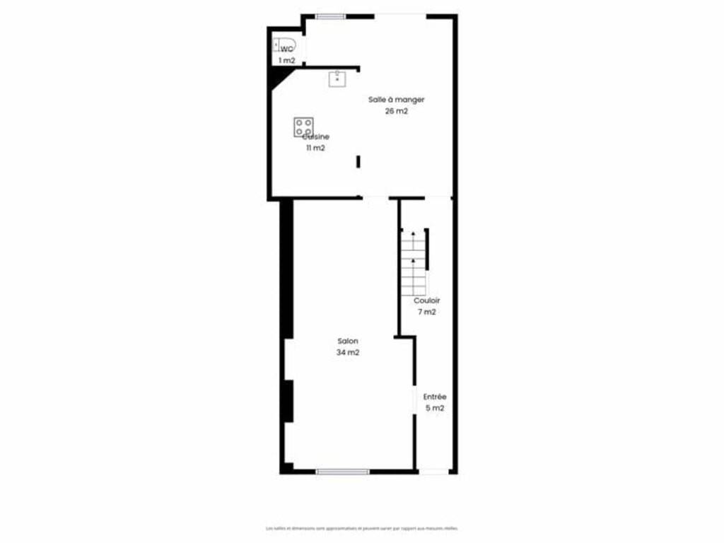 Au rez-de-chaussée : hall d'entrée, séjour (35m²), cuisine (23m²) et WC indépendant ;