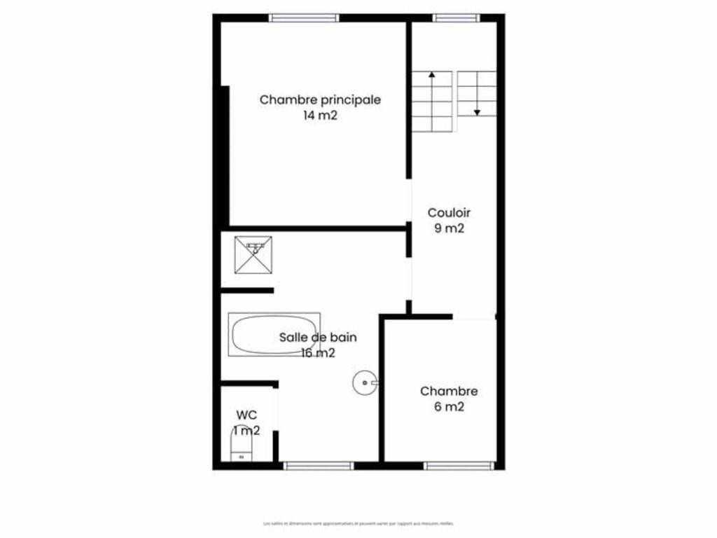 Au 1er étage : hall de nuit, une chambre (14m²), une salle de bain (13m²) ;