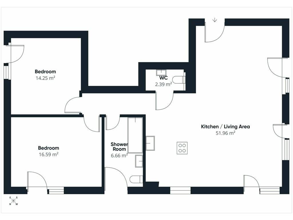 Apartment: living area (52 sqm) - bedrooms (16.6 sqm + 14.3 sqm) - bathroom (6.7 sqm) - separate WC (2.4 sqm)