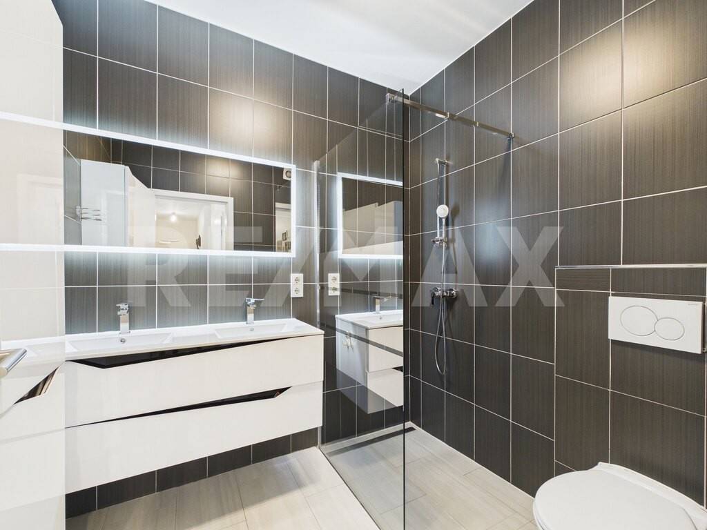 En Duschraum mat duebelem Lavabo an Toilette.