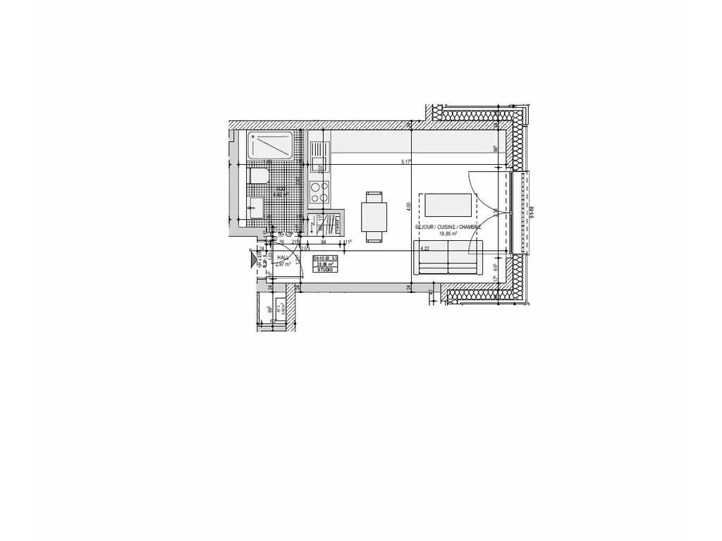 The 28m2 unfurnished studio (furniture and equiments on sale) is located on the 5th floor and is equipped with high quality finishes, a ventilation system, triple glazing, a smart home system and electric shutters.