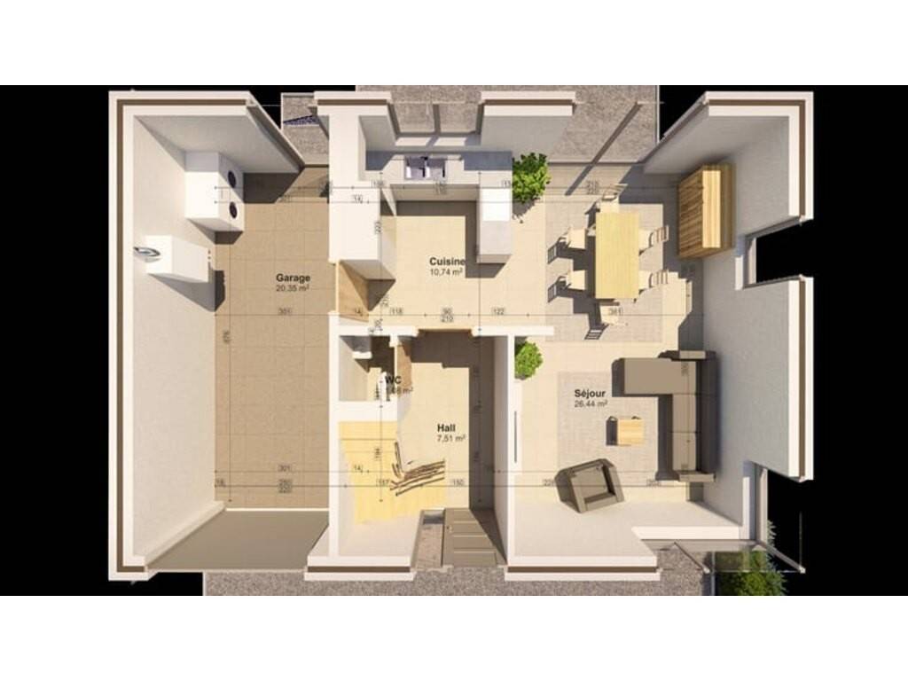 Au rez-de-chaussée : • Hall d'entrée accueillant avec WC indépendant • Séjour lumineux ouvert avec coin cuisine • Garage / buanderie • Jardin