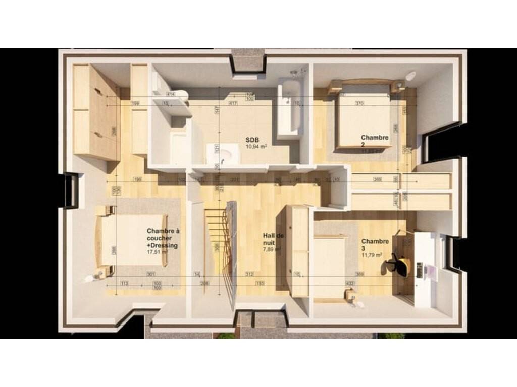 À l’étage : • Hall de nuit • 1 chambre principale avec dressing • 2 chambres • 1 salle de bain complète avec douche, baignoire, WC et lavabo