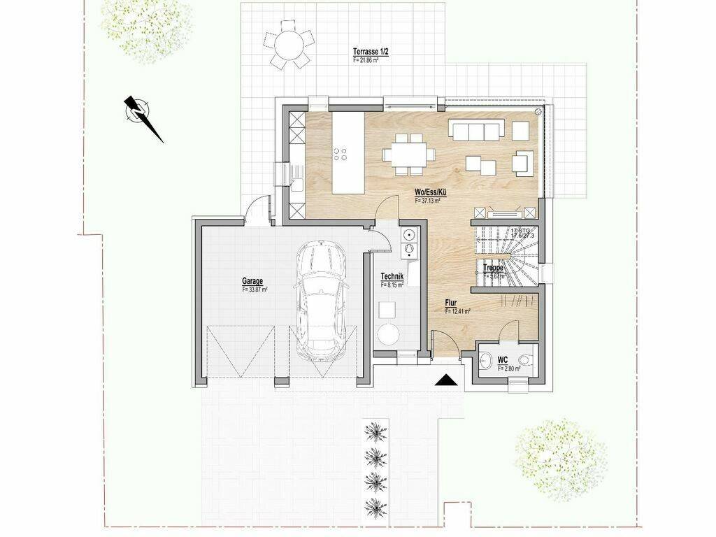 Hier erwartet Sie eine moderne, offene Einbauküche, die nahtlos in den großzügigen Wohnbereich übergeht und direkten Zugang zur Terrasse bietet. Ein praktischer Technikraum mit direktem Zugang zur großzügigen Doppelgarage ergänzt diese Etage.