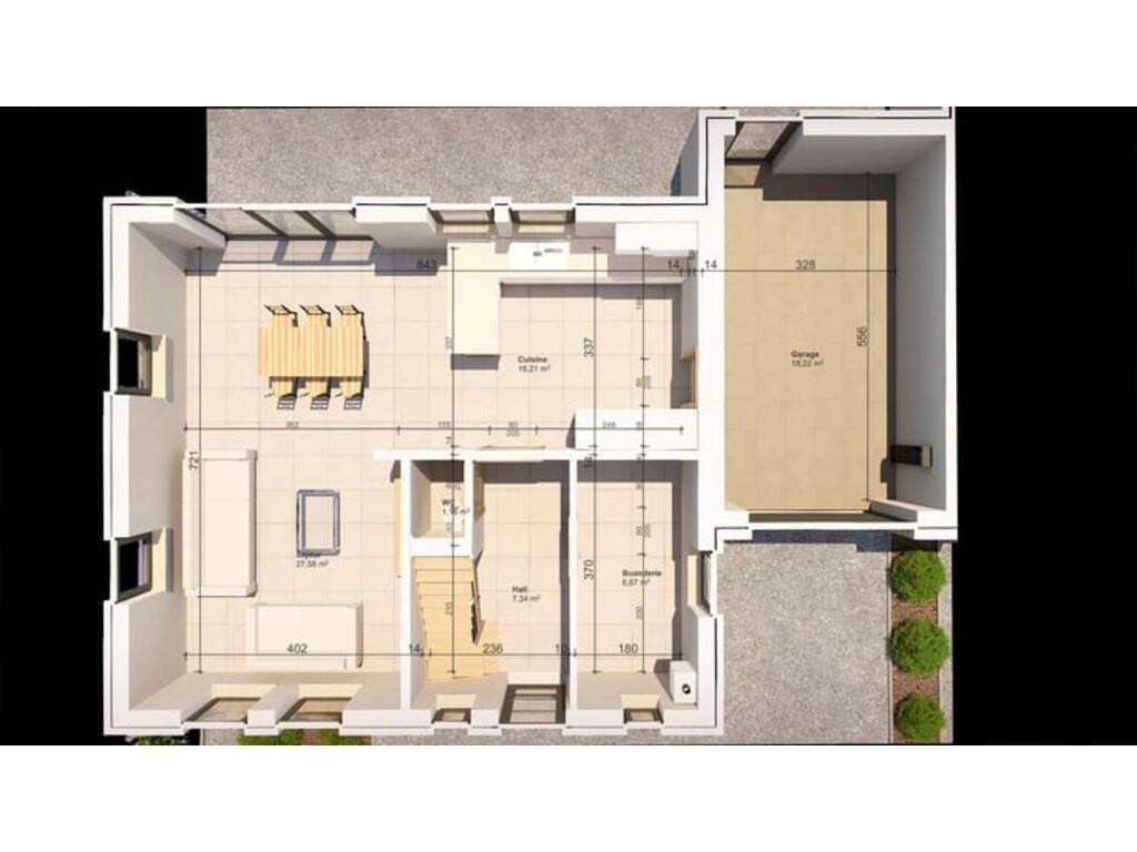Au rez-de-chaussée : • Hall d’entrée avec WC indépendant • Séjour lumineux ouvert sur la cuisine • Cuisine • Garage / Buanderie • Terrasse • Jardin
