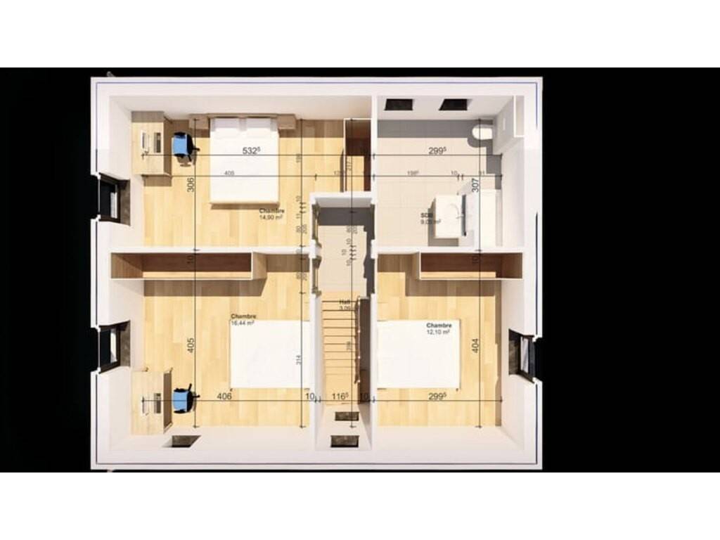 À l’étage : • Hall de nuit • 3 chambres • 1 salle d'eau avec douche, WC et lavabo
