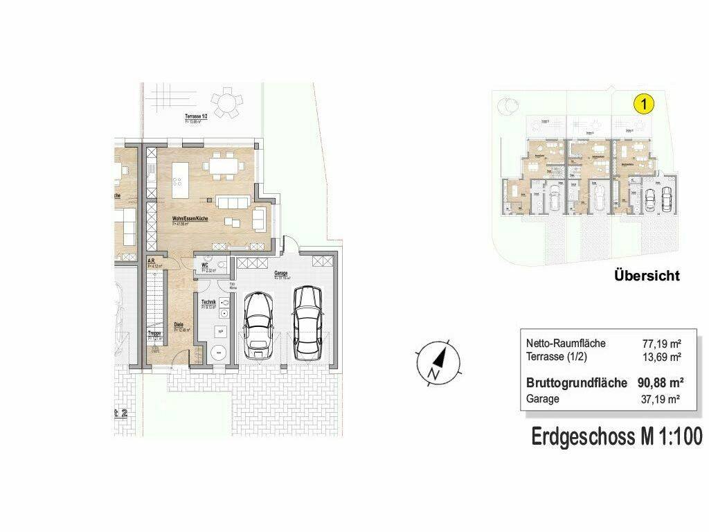 - Erdgeschoss: Hier erwartet Sie eine moderne, offene Einbauküche, die nahtlos in den großzügigen Wohnbereich übergeht und direkten Zugang zur Terrasse bietet. Ein praktischer Technikraum mit direktem Zugang zur großen Doppelgarage ergänzt diese Etage.