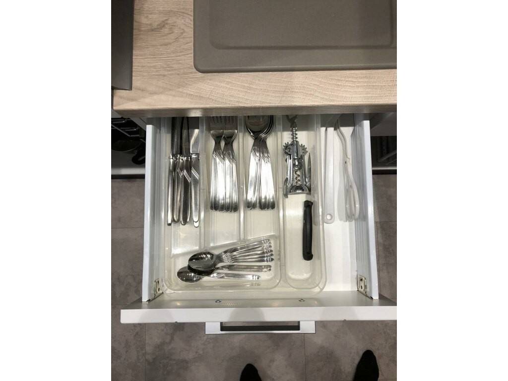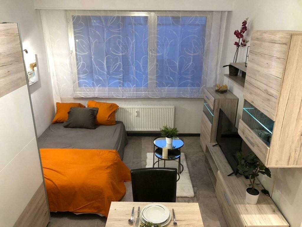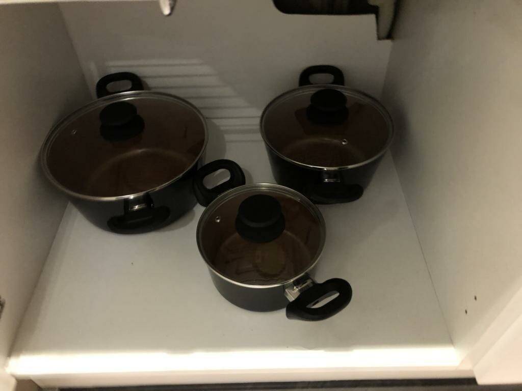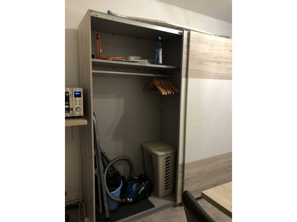 • le côté séjour/chambre est équipé d'armoires de rangement, canapé/lit à 3 places (140/200 cm), petite tables de salon, table et fer à repasser, aspirateur et télévision ;