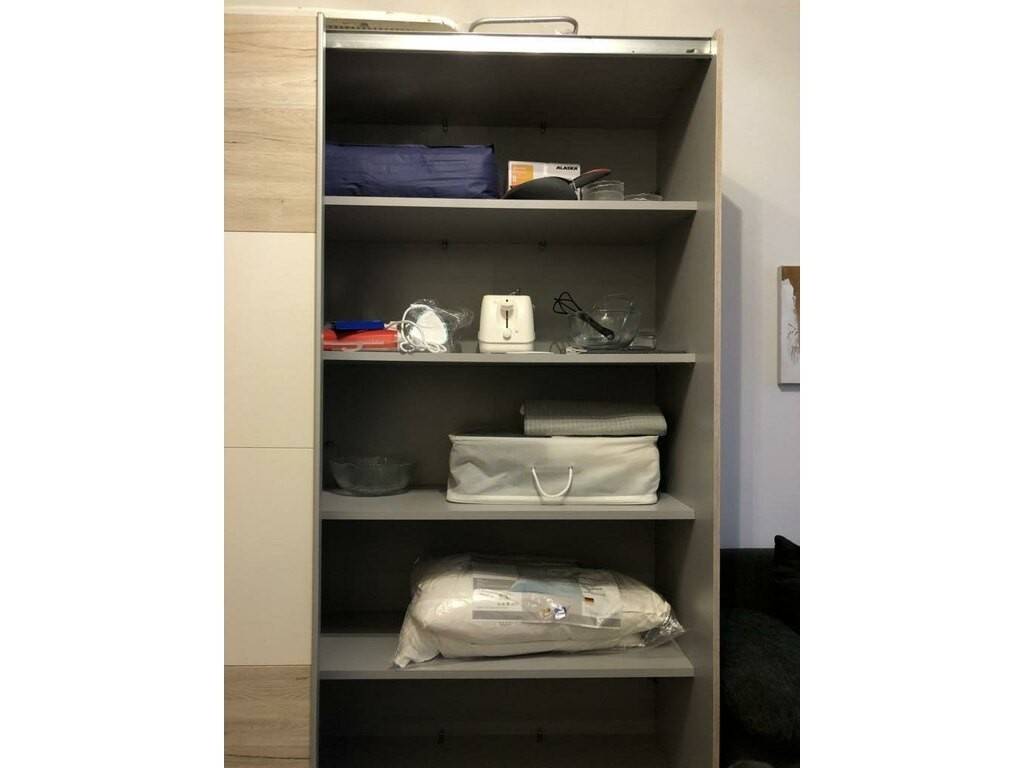 • le côté chambre est équipé d'une grande armoire à vêtements (1 couette, 2 oreillers, 2 parures complètes de draps de lit, taies d'oreillers et housses de couette) ;