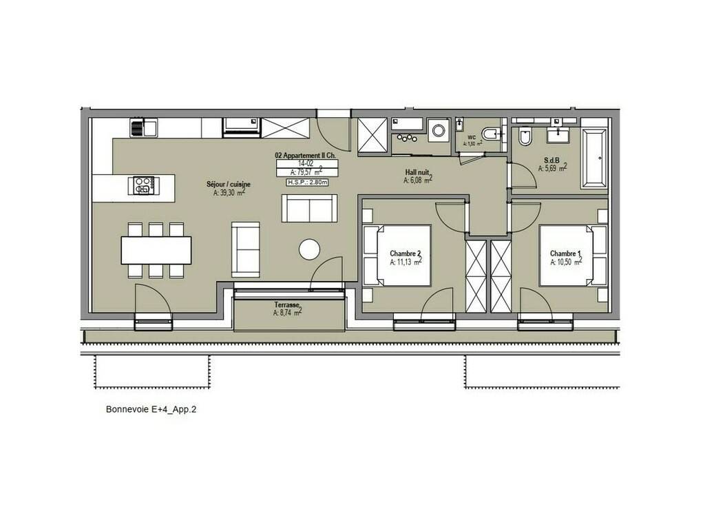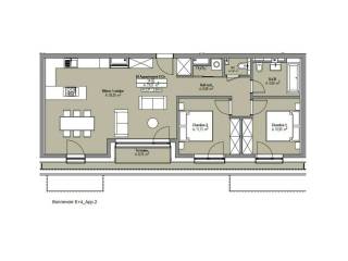 Le penthouse A.04.2 se compose d'une cuisine ouverte sur le séjour et une terrasse spacieuse attenante, un WC séparé, deux chambre à coucher , une salle de bains. Un débarras avec les raccordements pour installer le lave-linge dans l'appartement.