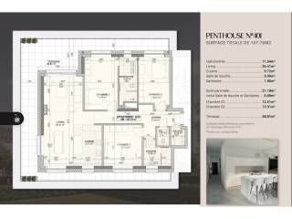 Located on the 4th floor, this three-bedroom penthouse features 107.76 m2 of living space and a large 48.81 m2 terrace that surrounds the entire penthouse with various access points. This magnificent penthouse will have a basement parking space and a large 6.95 m2 cellar.