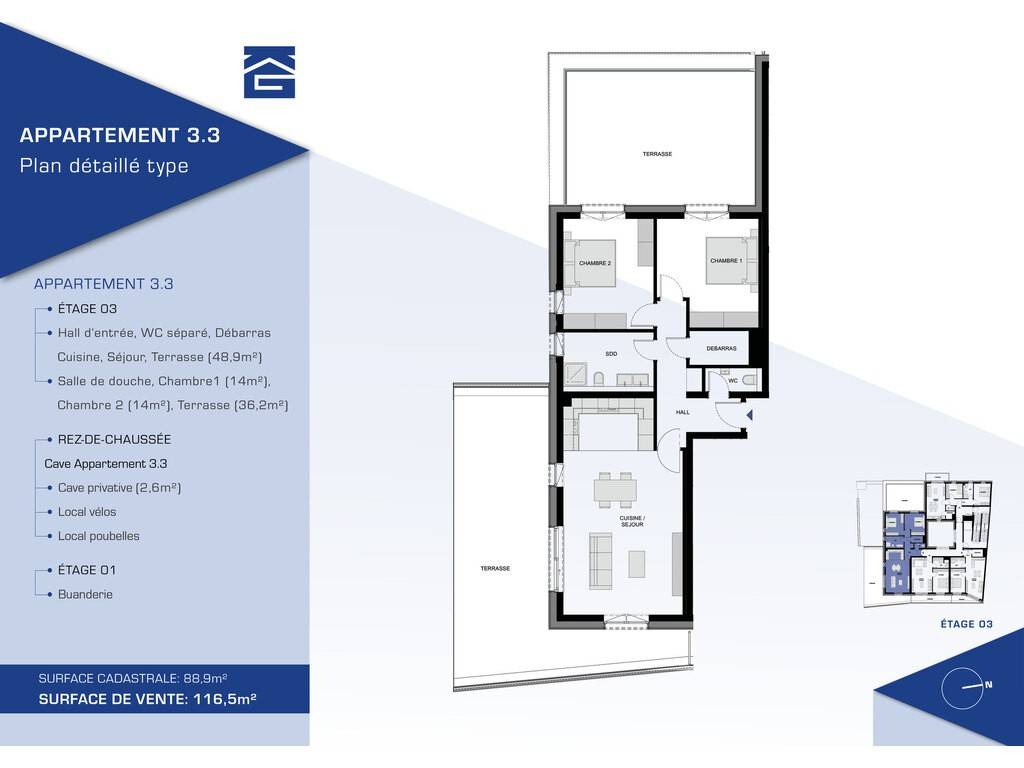The apartment benefits from two terraces of 38.81m2 resp. 36.22m2 and a cellar of 2.60m2.