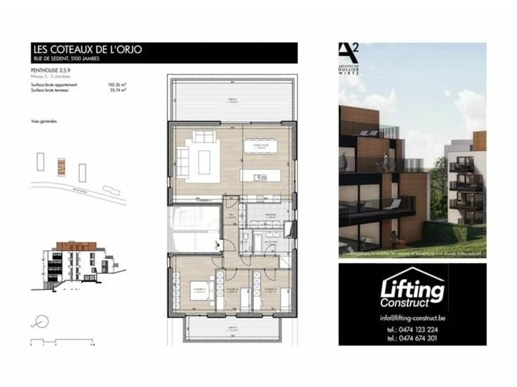Découvrez ce penthouse neuf Basse-Energie d'environ 150 m². Implanté dans une copropriété de 26 appartements répartis en 3 immeubles, il est situé à proximité immédiate de la ville (grands axes, commerces, écoles, transports en commun, ..) tout en offrant un cadre calme et champêtre. Le projet se trouve à côté d'un bois permettant d'agréables balades vers Géronsart. Vous serez séduits par ses espaces de vie spacieux et lumineux, ses terrasses privatives bien orientées et son confort énergétique (chauffage par le sol, ventilation double flux, châssis alu, ..).Il offre un hall d'entrée avec wc, un séjour ouvert sur une cuisine-équipée de 59m², une buanderie, 3 chambres et une salle de bain (baignoire et douche). Parking extérieur moyennant supplément de 10.000euros. Possibilité d'acquérir une cave moyennant supplément.
