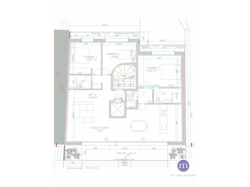 Appartement/penthouse sis au 4ème et dernier étage de 97,38 m2 avec une surface terrasse de 26,56 m2 et comprenant: living avec cuisine ouverte donnant sur terrasse, 3 chambres à coucher , 2 salles de douche, WC séparé, hall d'entrée, cave privative 9,35 m2 et un emplacement de parking intérieur automatique (parklift), buanderie commune et local vélos.