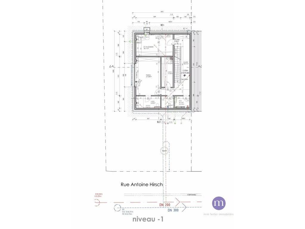 sous-sol: hobby-room, salle de douche, buanderie, caves, couloir et escaliers