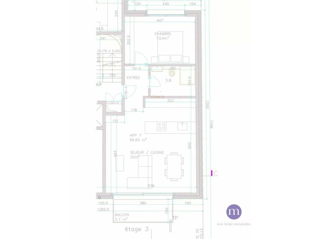 Appartement sis au 3ème étage de 56,65 m2 avec une surface balcon de 5,70 m2 et comprenant: living avec cuisine ouverte donnant sur balcon, 1 chambre à coucher, salle de douche, hall d'entrée, cave privative 4,25 m2 et un emplacement de parking intérieur automatique (parklift), buanderie commune et local vélos.