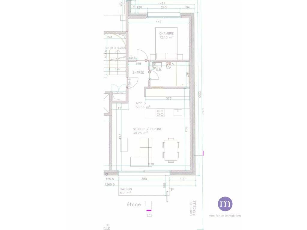 Appartement sis au 1er étage de 56,65 m2 avec une avec un balcon 5,70 m2 et comprenant: living avec cuisine ouverte donnant sur balcon, 1 chambre à coucher donnant également sur terrasse, salle de douche avec WC, hall d'entrée, cave privative 4,07 m2 et un emplacement de parking intérieur automatique (parklift), buanderie commune et local vélos.