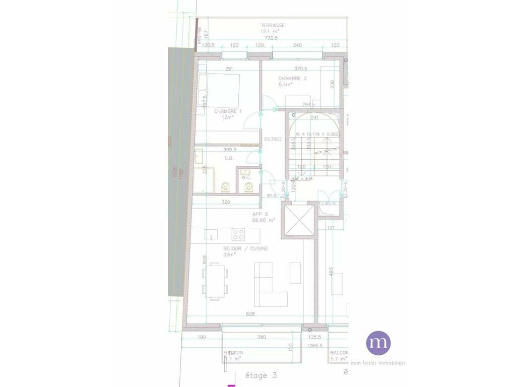 Appartement sis au 3ème étage de 66,60 m2 avec une surface balcon de 5,70 m2 et comprenant: living avec cuisine ouverte donnant sur balcon, 2 chambres à coucher donnant sur balcon arrière, salle de douche, hall d'entrée, cave privative 4,33 m2 et un emplacement de parking intérieur automatique (parklift), buanderie commune et local vélos.