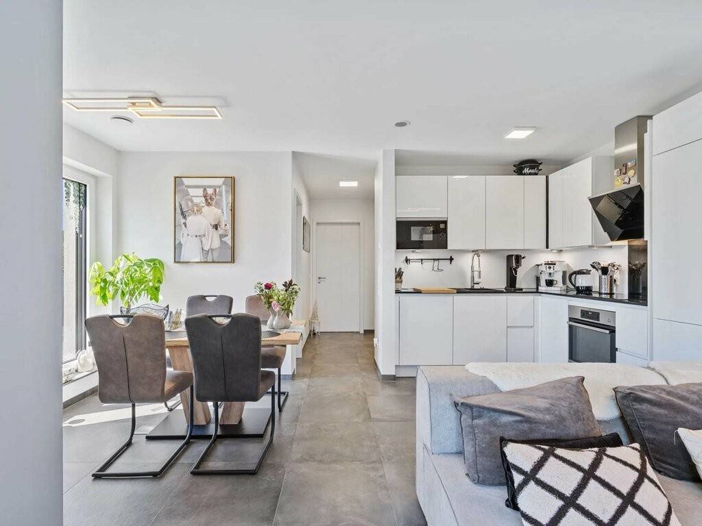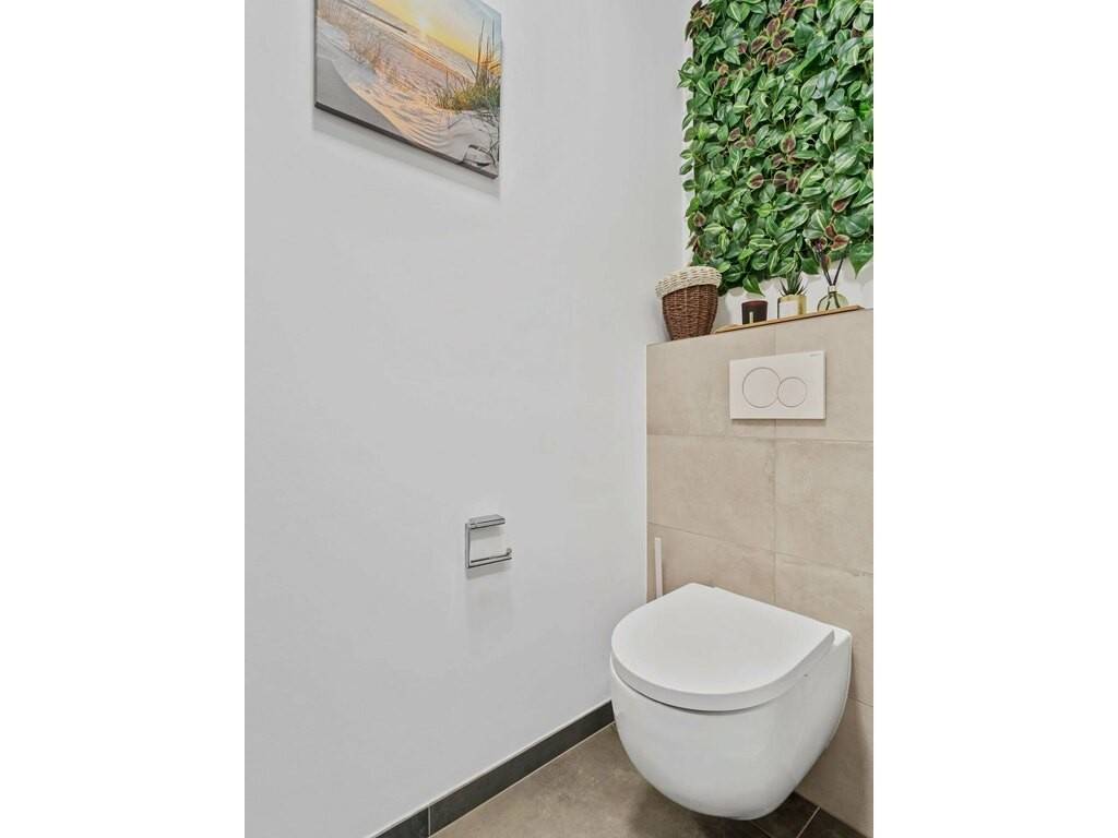 The entrance hall with separate WC, a first bedroom of ±12.40m² with en suite shower room, to the light-filled living room with open, fully-equipped kitchen (AEG appliances and granite worktops).