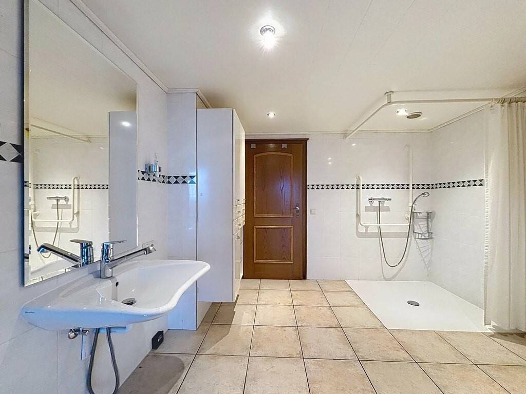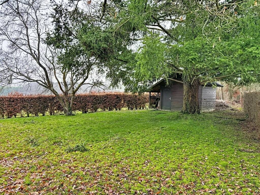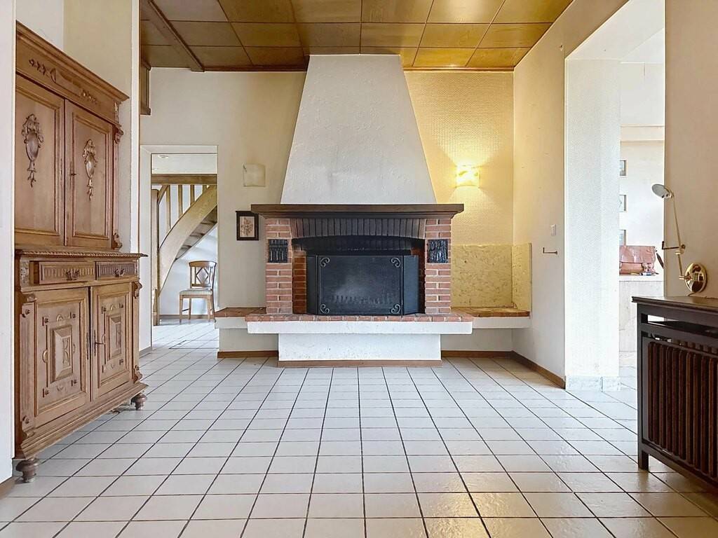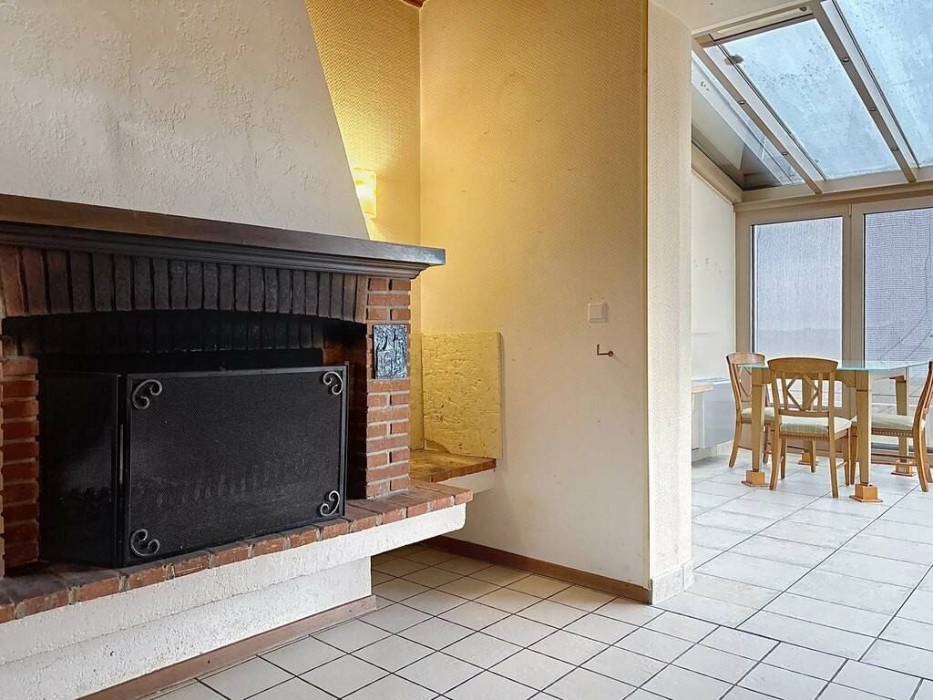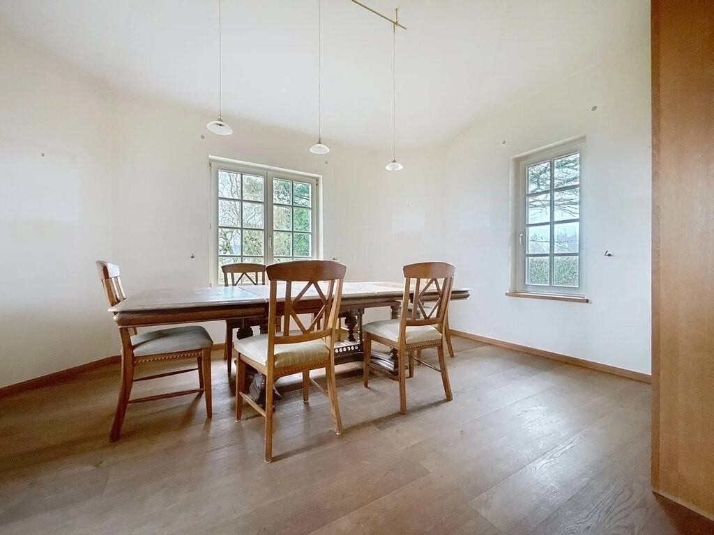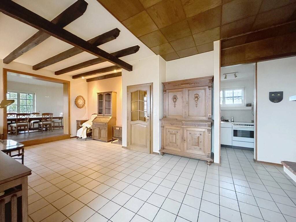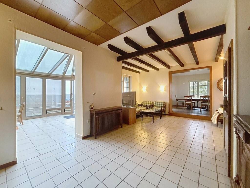 Le rez-de-chaussée accueille un hall d’entrée, une petite kitchenette, un spacieux living de 38 m² avec feu ouvert, une véranda lumineuse, une chambre à coucher ainsi que deux salles de bains. Une terrasse d’environ 30 m² prolonge agréablement les espaces de vie vers l’extérieur. Les combles offrent une chambre mansardée de 15 m², idéale comme chambre d’appoint ou espace bureau.