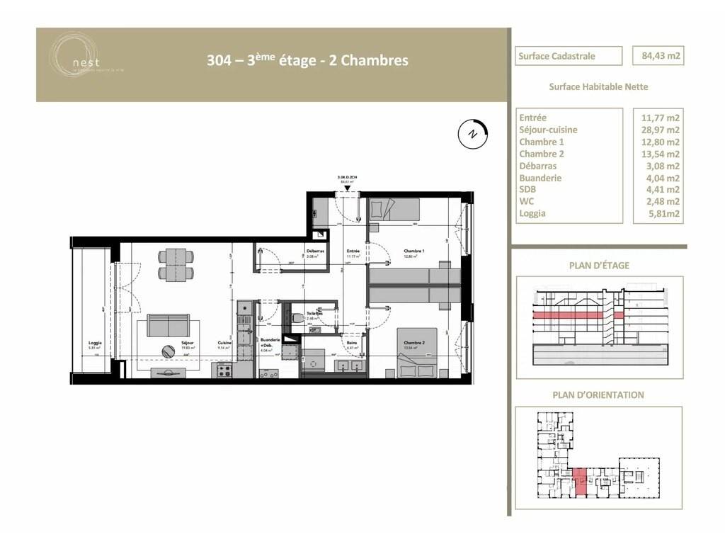 Apartment Lot 3.04.D.2CH is located on the 3rd floor and has a cadastral area of ±84.43m², a loggia of ±5.75m² and is composed as follows: