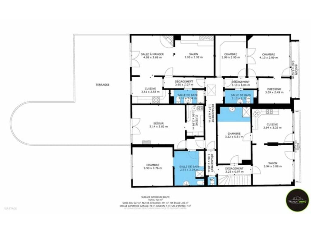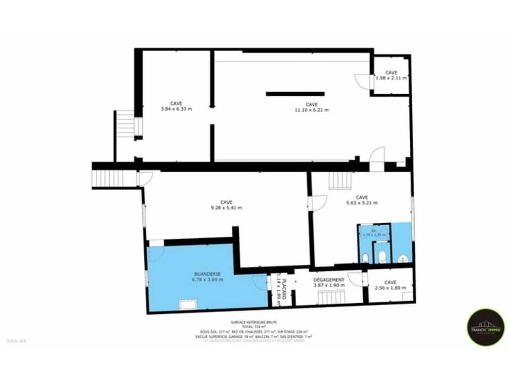 Un vaste sous-sol couvrant toute la surface, comprenant caves, buanderie et annexes, idéal pour entreposage ou aménagement supplémentaire.