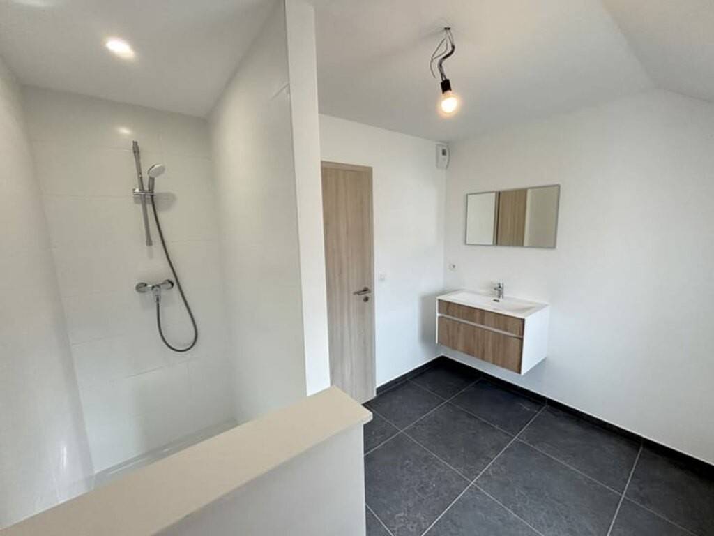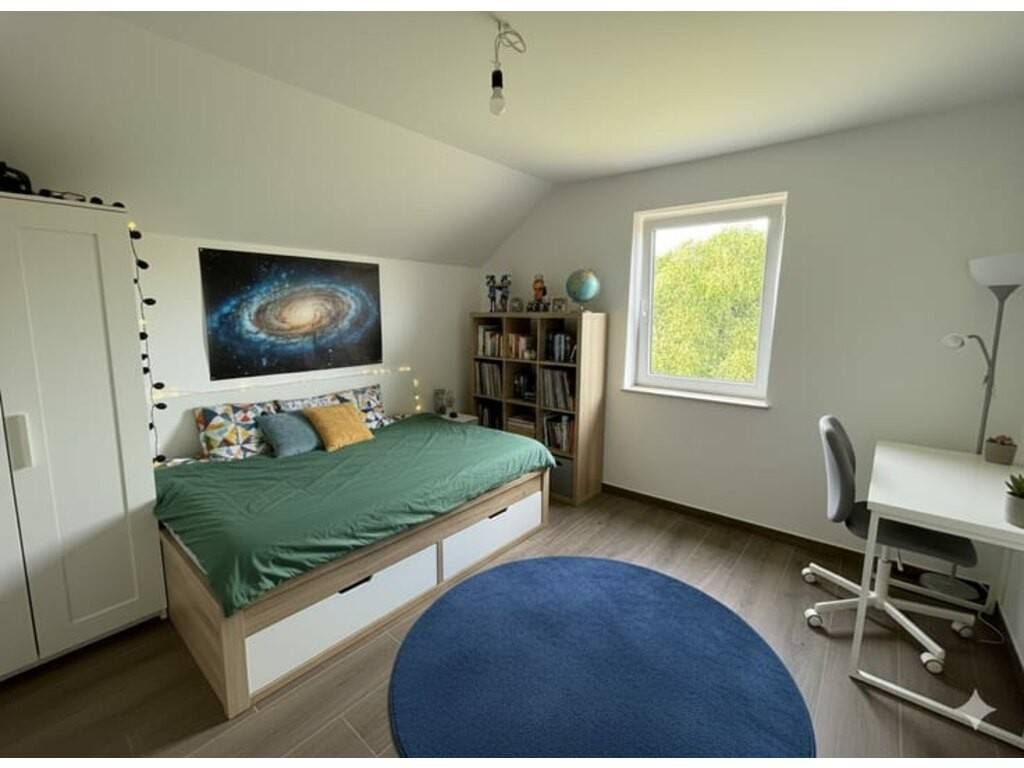 Le rez-de-chaussée comprend un séjour de +/-29 m² et une cuisine de +/-14 m², ainsi qu’une buanderie de +/-6 m² et un bureau de +/-10 m². À l’étage, le hall de nuit dessert la chambre parentale de +/-16 m², trois autres chambres de +/-13 m², +/-11 m² et +/-10 m², une salle de bain de +/-7 m² et une salle de douche. Un grenier est accessible pour rangement ou aménagement ultérieur.
