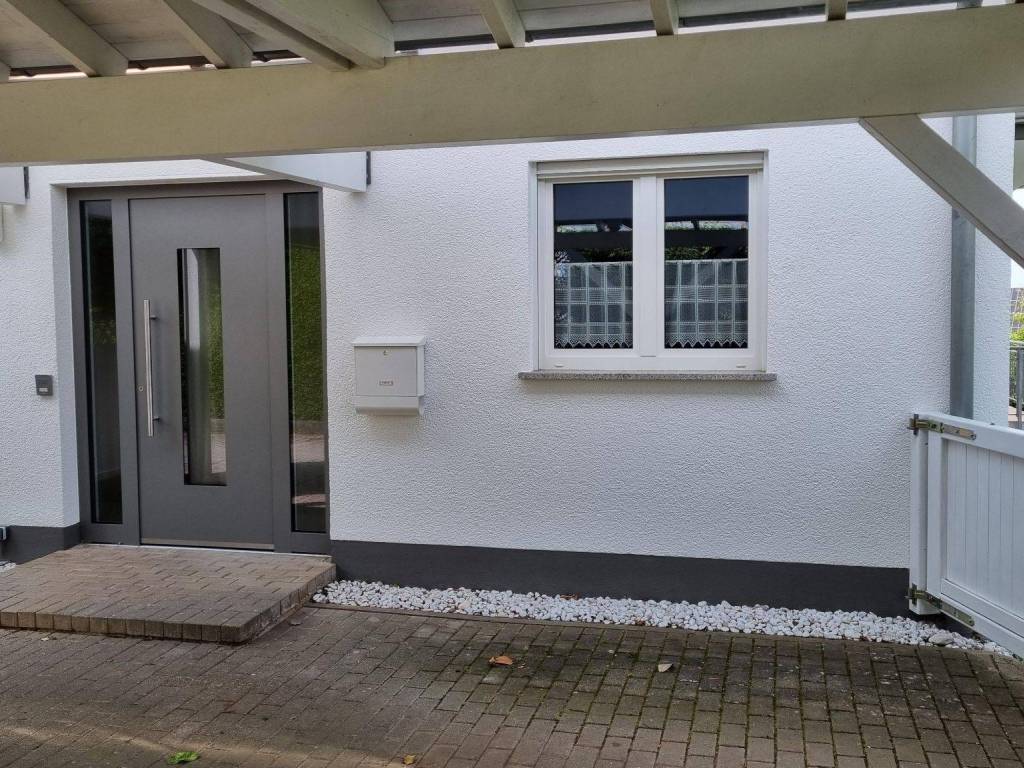 Ein grosser Carport bietet direkten Zugang zum überdachten Eingangsbereich. Der Aussenbereich umfasst einen idyllischen und pflegeleichten Garten sowie 2 Balkone und eine überdachte Terrasse in sonniger Südwest-Lage.