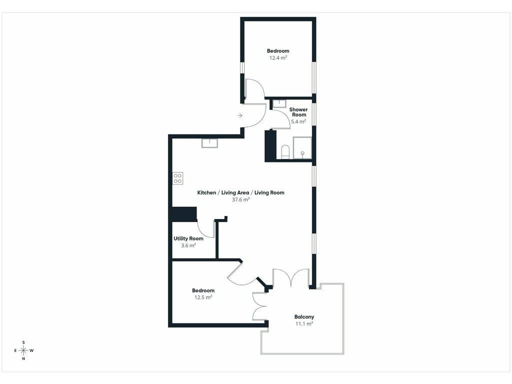Layout: open-plan kitchen/living/dining room (37.6 sqm) with access to the large balcony - storage room (3.6 sqm) - two bedrooms (12.5 + 12.4 sqm), one of which also has access to the balcony - shower room with washbasin and walk-in shower (5.4 sqm)