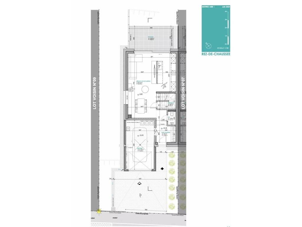 Au rez-de-chaussée : - garage pour 1 voiture et un emplacement extérieur pour 2 voitures - hall d'entrée - cuisine spacieuse dans un grand séjour avec accès vers la terrasse de 15,99m2 et son jardin - débarras - WC séparé