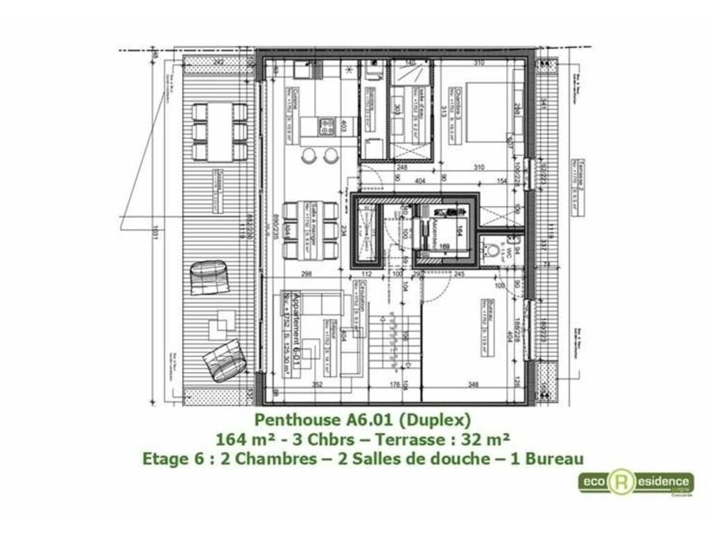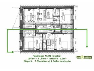 Composition : séjour / cuisine ouverte lumineux, 3 chambres, 3salle de douche, WC séparé et terrasse de 32m².