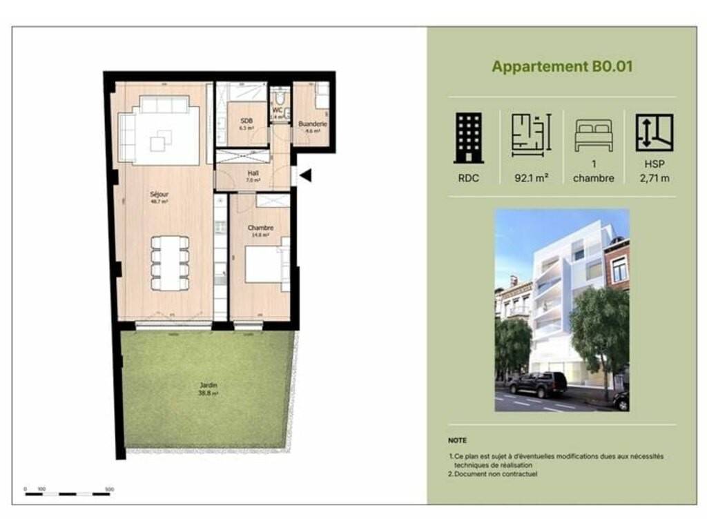 Composition : salon / cuisine ouverte de 48 m², 1 chambre, salle de bain, buanderie et WC séparé.