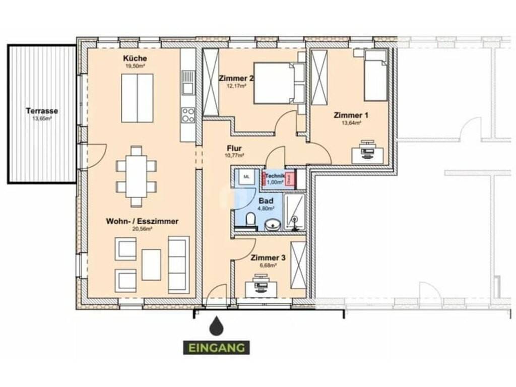 Couloir Trois chambres à coucher - pour des nuits reposantes Salle de bain moderne avec WC Cuisine élégante - incluse ! Salle de séjour lumineuse - pour se détendre Salle à manger confortable - parfaite pour les soirées conviviales Local technique - pour plus d'espace de rangement