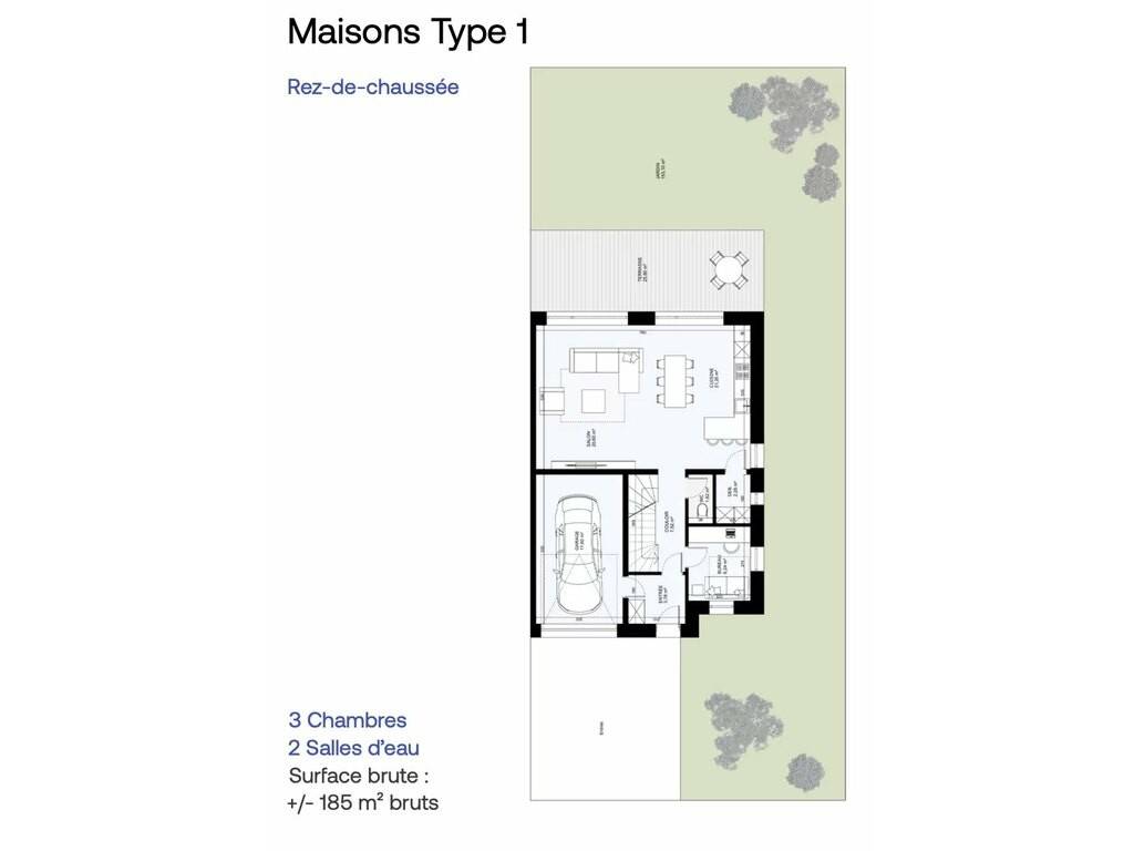 Proposées sur des terrains 3,53 ares à 3,76 ares, les maisons de type 1 jumelées d'un côté disposeront d'une surface totale de +/- 185 m2.