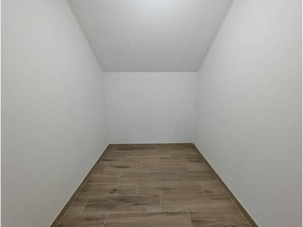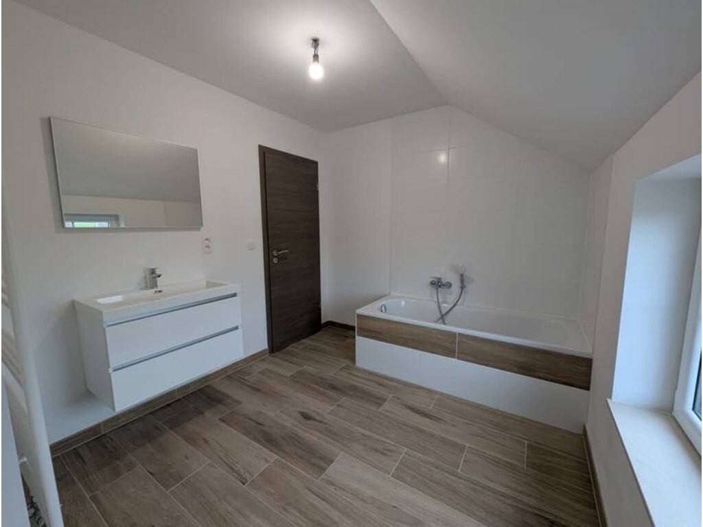 Le rez-de-chaussée se compose d’un hall d’entrée de +/- 1 m², d’un WC de +/- 1 m², d’un séjour de +/- 27 m² en relation directe avec l’extérieur, d’une cuisine de +/- 11 m² et d’un espace garage-buanderie de +/- 21 m². À l’étage, le hall de nuit de +/- 8 m² dessert trois chambres de +/- 12 m², +/- 12 m² et +/- 15 m², ainsi qu’une salle de bain de +/- 10 m².