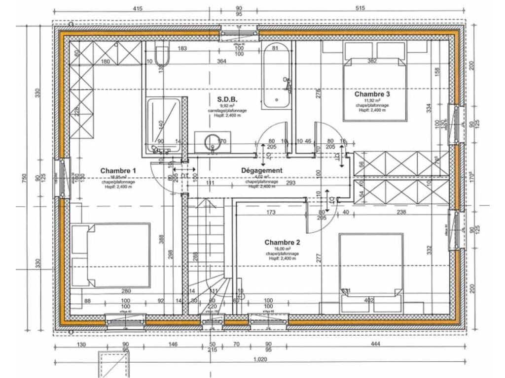 À l’étage : • Hall de nuit • 1 chambre principale • 2 chambres • 1 salle de bain complète avec douche, baignoire, WC et lavabo