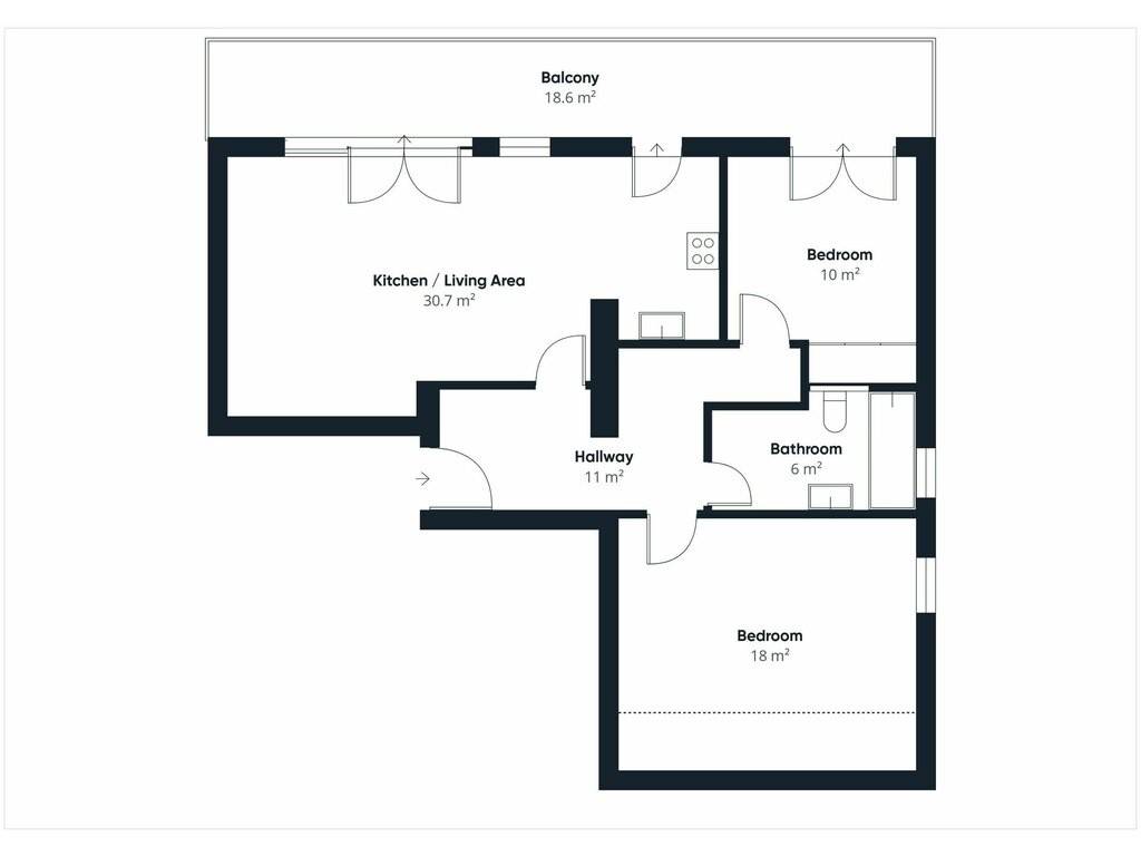 Apartment: living room with open-plan kitchen (29.1 sqm) - bedrooms (18.2 sqm+ 10.2 sqm) - bathroom (6.4 sqm) - entrance hall (11.6 sqm)