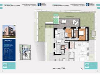 En façade principale se trouvent l'entrée pour piétons et l'accès au garage commun. La rési­dence comporte un sous-sol, un rez-de-chaus­sée et quatre étages. Au sous-sol nous retrou­vons les emplacements privatifs, les caves, les locaux communs et autres locaux techniques. Les étages et le rez-de-chaussée sont réservés à l‘habitation ou toute destination admise par les règlements administratifs afférents.