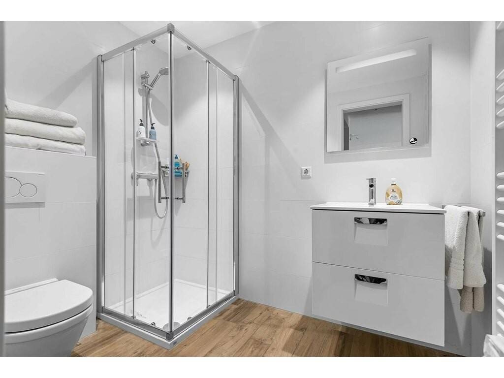 An entrance hall with built-in cloakroom (approx. 5m²) leads to a bright living room (approx. 23m²) with a fully fitted Ixina open-plan kitchen (new in 2026). The living room opens onto a terrace of approx. 6 m² at the rear of the building, offering a peaceful setting and unobstructed views. The flat also features a lovely bedroom (approx. 12 m²) with access to the terrace and a modern shower room with a toilet, vanity unit and heated towel rail.