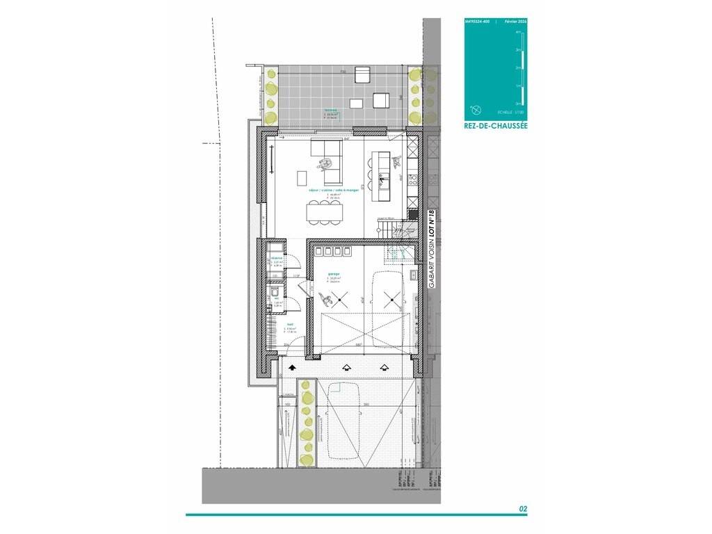 - entrance hall - kitchen - large living room with access to 25.56 m2 terrace and garden - separate WC - two-car garage - 2 outdoor parking spaces - storeroom