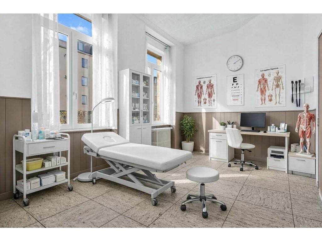 Un espace professionnel indépendant comprend un bureau de consultation, une salle d’attente, une seconde cuisine ainsi qu’un WC.